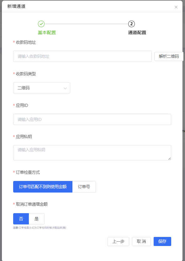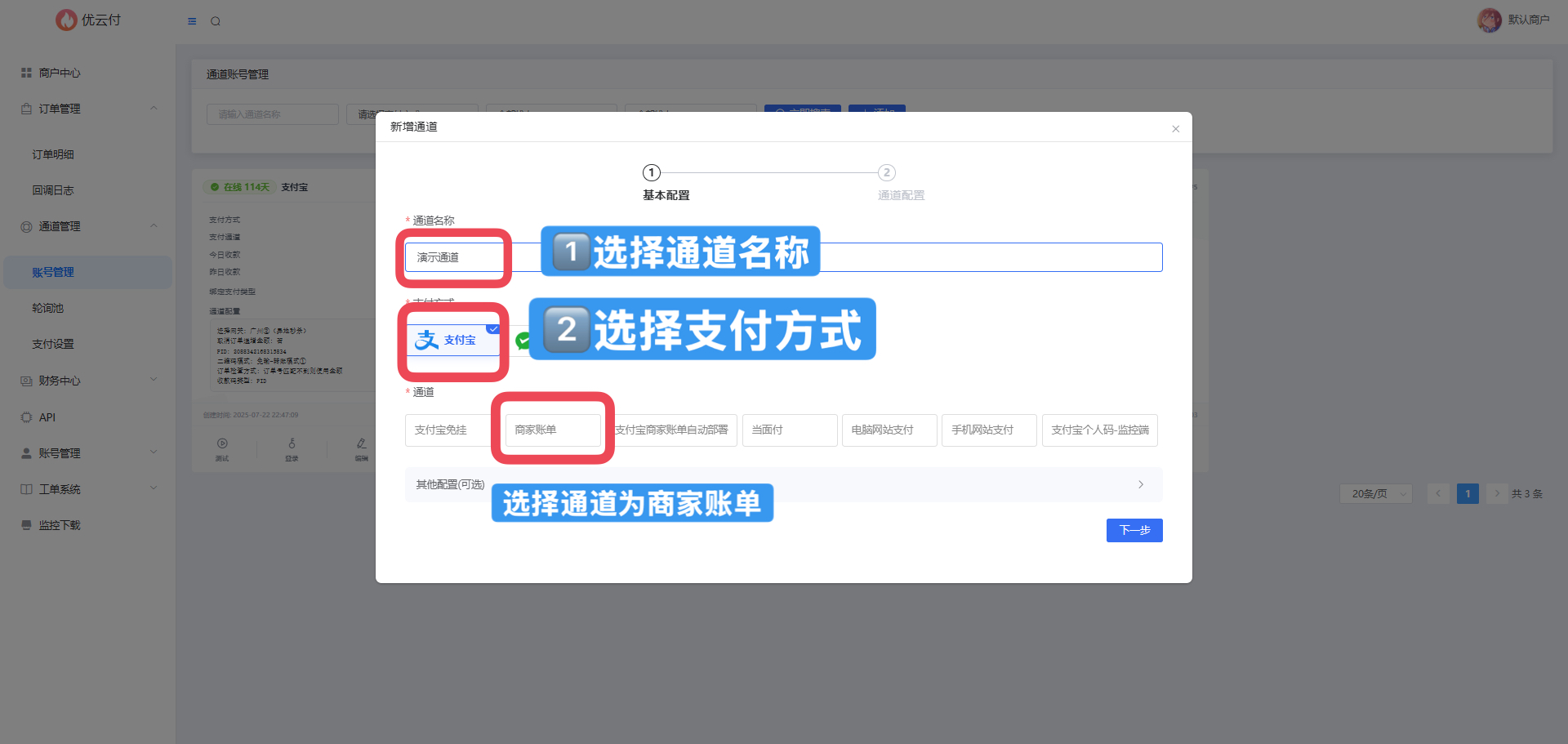 点击新增通道,然后选择支付方式,通道选择商家账单,然后点击下一步